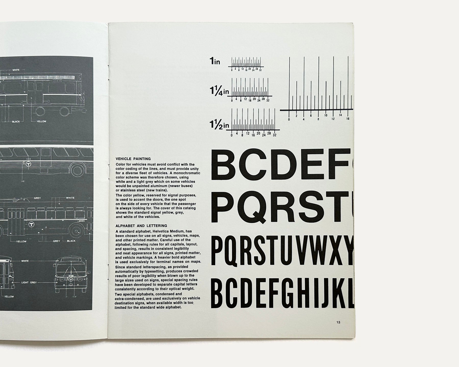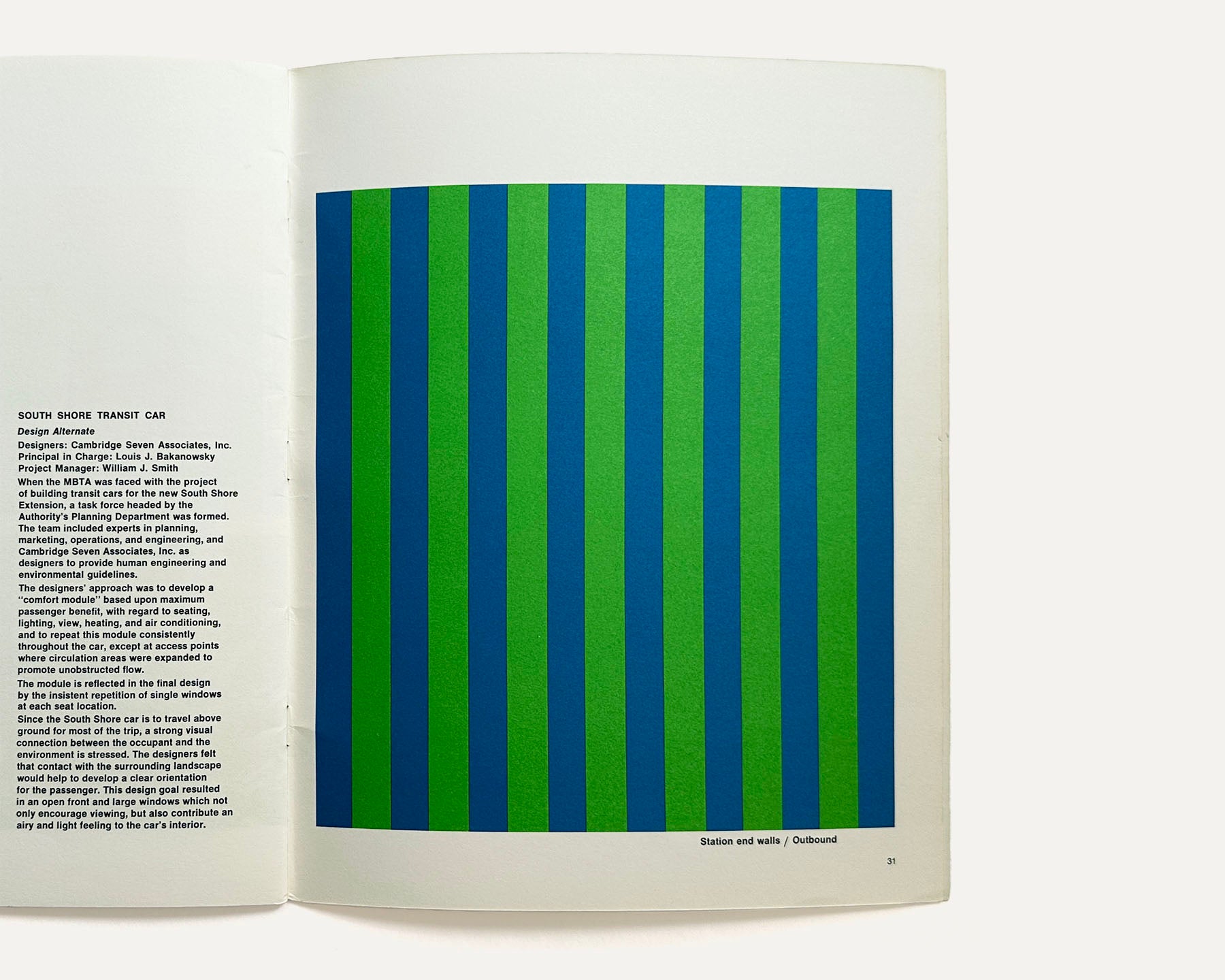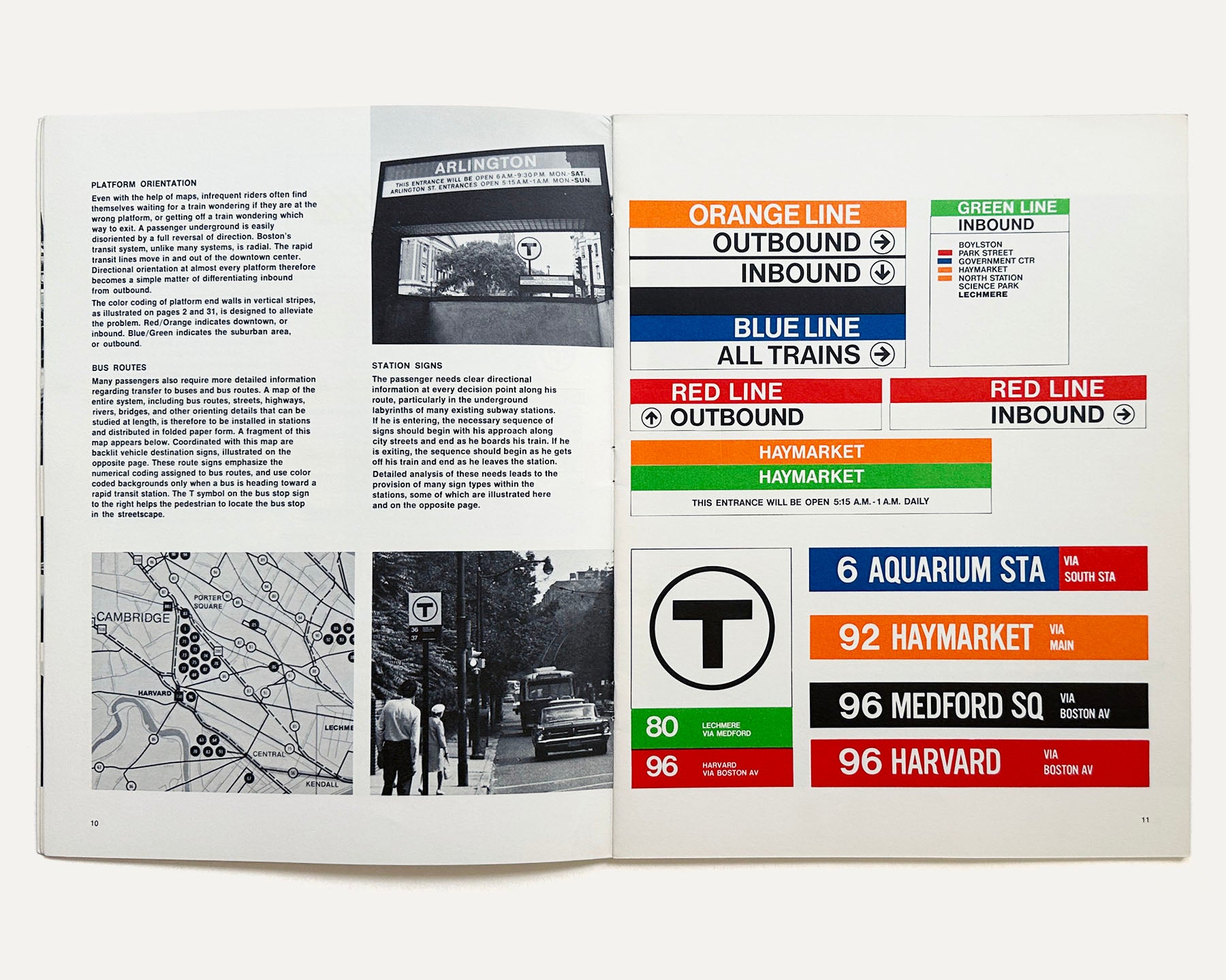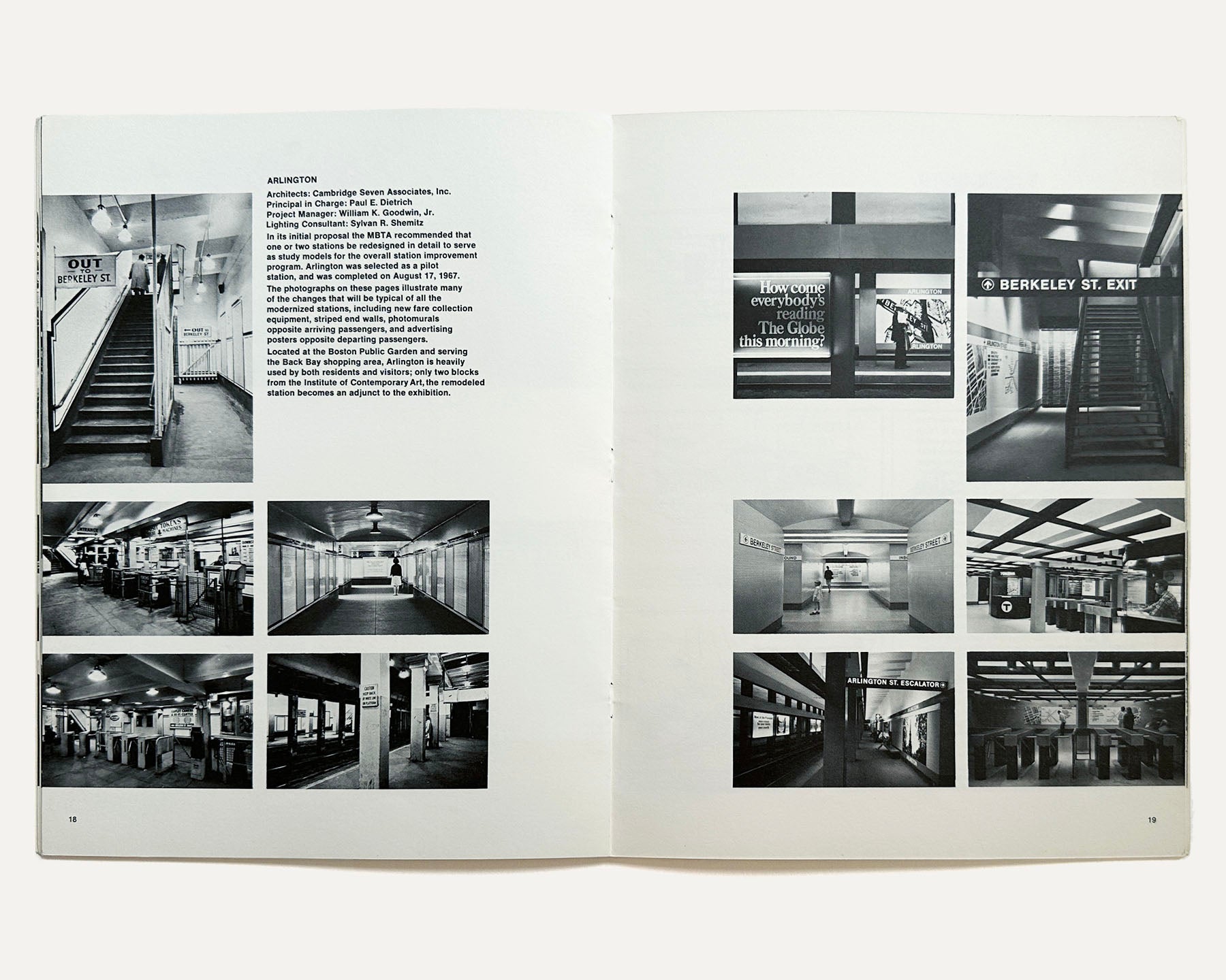 This catalog features descriptive texts, black and white photographs and colored graphics related to project improvements: the MBTA Symbol, Structure and Coding, Platform Orientation, Bus Routes, Station Signs, Vehicle Painting, Alphabet and Lettering, Station Equipment and Lighting, Platform and Walls, and the Manual of Guidelines and Standards (by Cambridge Seven Associates). Additionally there is detailed information about many stations and kiosks, etc. including: Arlington, Columbia, Copley, Government Center, Quincy Center, Park Street Information Office, Kenmore, Haymarket, Wollaston, Government Center Kiosk and others. With a page of Acknowledgments, Participating Architects and others at the end.