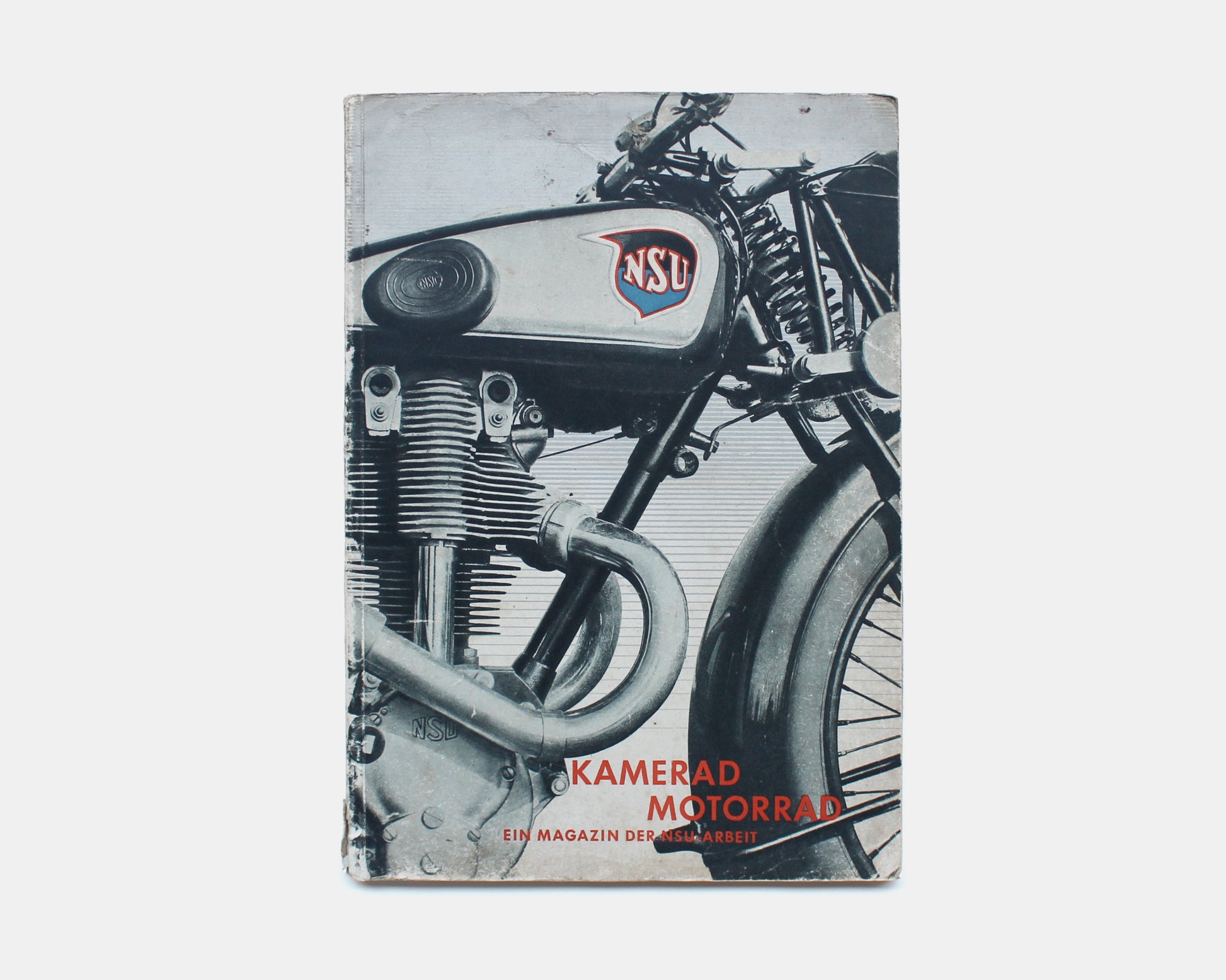 Kamerad Motorrad: Ein Magazine Der NSU Arbeit by Arthur Westrup, 1939. NSU Werke Aktiengesellschaft Neckarsulm, Germany. 8.25 x 11.75, pp. 48 with german text. Design and photography by Anton Stankowski; with seven photos by W. Nagel. Gravure printing by Chr. Belser, Stuttgart, Germany.