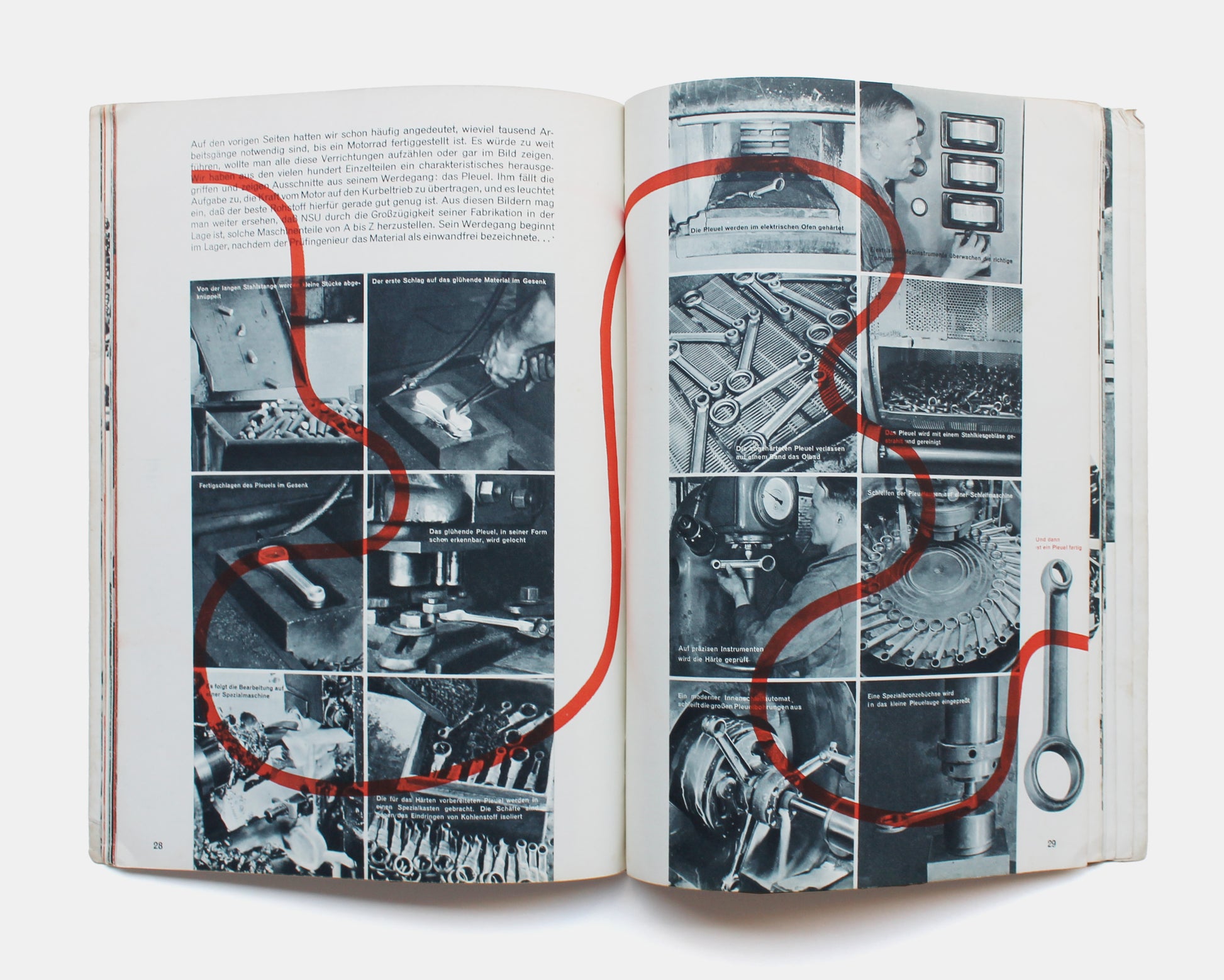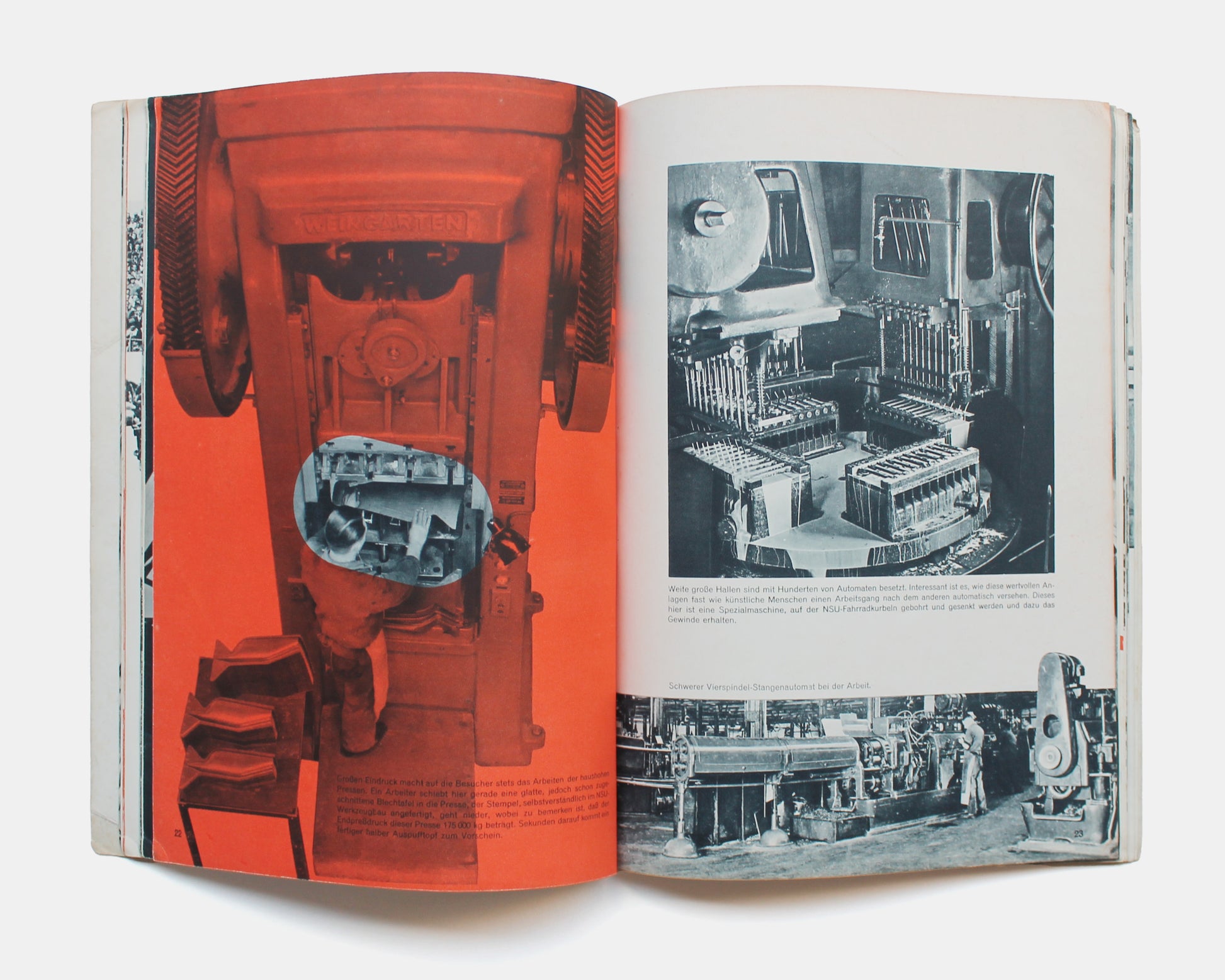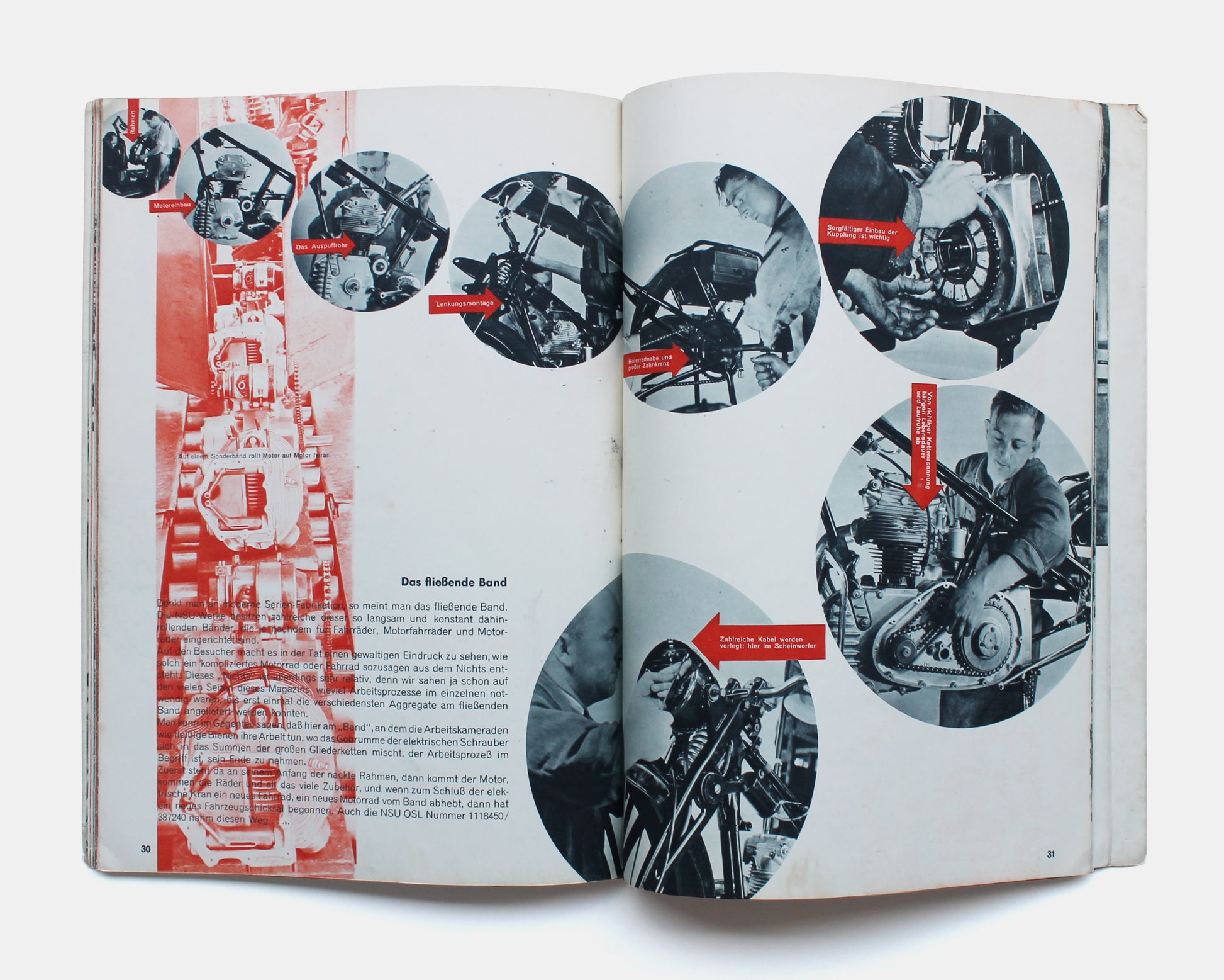 Published as a one-time publication by NSU Work; the German manufacturer of bicycles, motorcycles and automobiles, founded in 1873. With text throughout by Westrup, the advertising specialist who later led NSU's marketing department and helped find a larger audience. This promotional catalog [magazine] beautifully illustrates what a motorcycle is, how it is created–from the concept of the technical draftsman, down to the last detail. And finally, its use. Lavishly printed with New Vision photographs and avant-garde graphic design. The full-page, back cover advertisement is designed by Stankowski–[Emil] Zander.