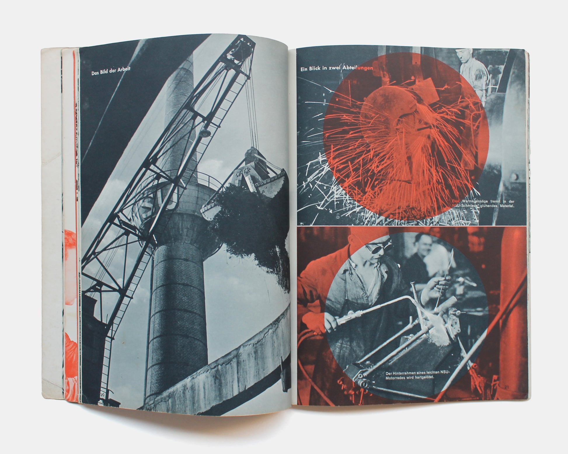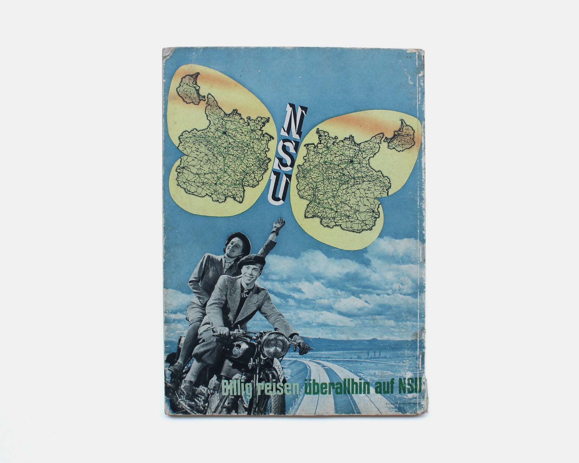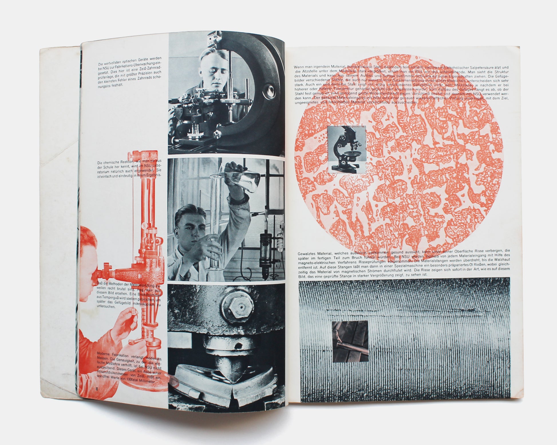 Published as a one-time publication by NSU Work; the German manufacturer of bicycles, motorcycles and automobiles, founded in 1873. With text throughout by Westrup, the advertising specialist who later led NSU's marketing department and helped find a larger audience. This promotional catalog [magazine] beautifully illustrates what a motorcycle is, how it is created–from the concept of the technical draftsman, down to the last detail. And finally, its use. Lavishly printed with New Vision photographs and avant-garde graphic design. The full-page, back cover advertisement is designed by Stankowski–[Emil] Zander.
