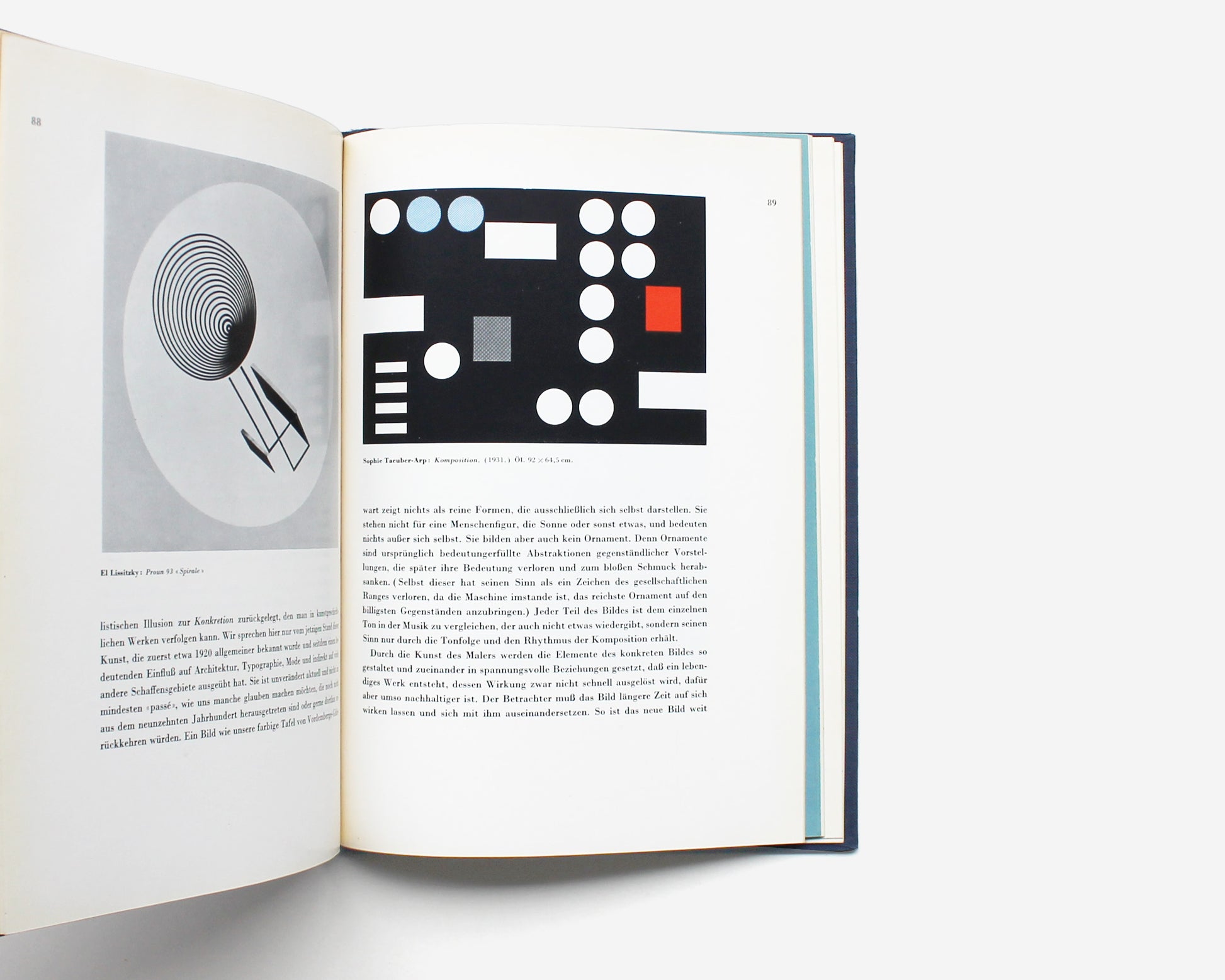 Illustrated throughout with black and white and color examples with some printed on a variety of papers throughout by: Tschichold, Giambattista Bodoni, Wladyslaw Strzeminski, Max Bill, El Lissitzky, Josef Albers, Friedel Vordemberge-Gildewart, Laszlo Moholy-Nagy, Sophie Taeuber-Arp, Herbert Bayer, Zdenek Rossmann, Ladislav Sutnar, Walter Cyliax and others.